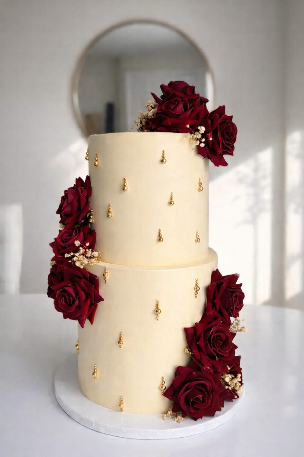 A timeless wedding cake featuring delicate maroon floral details and stylish gold beads.