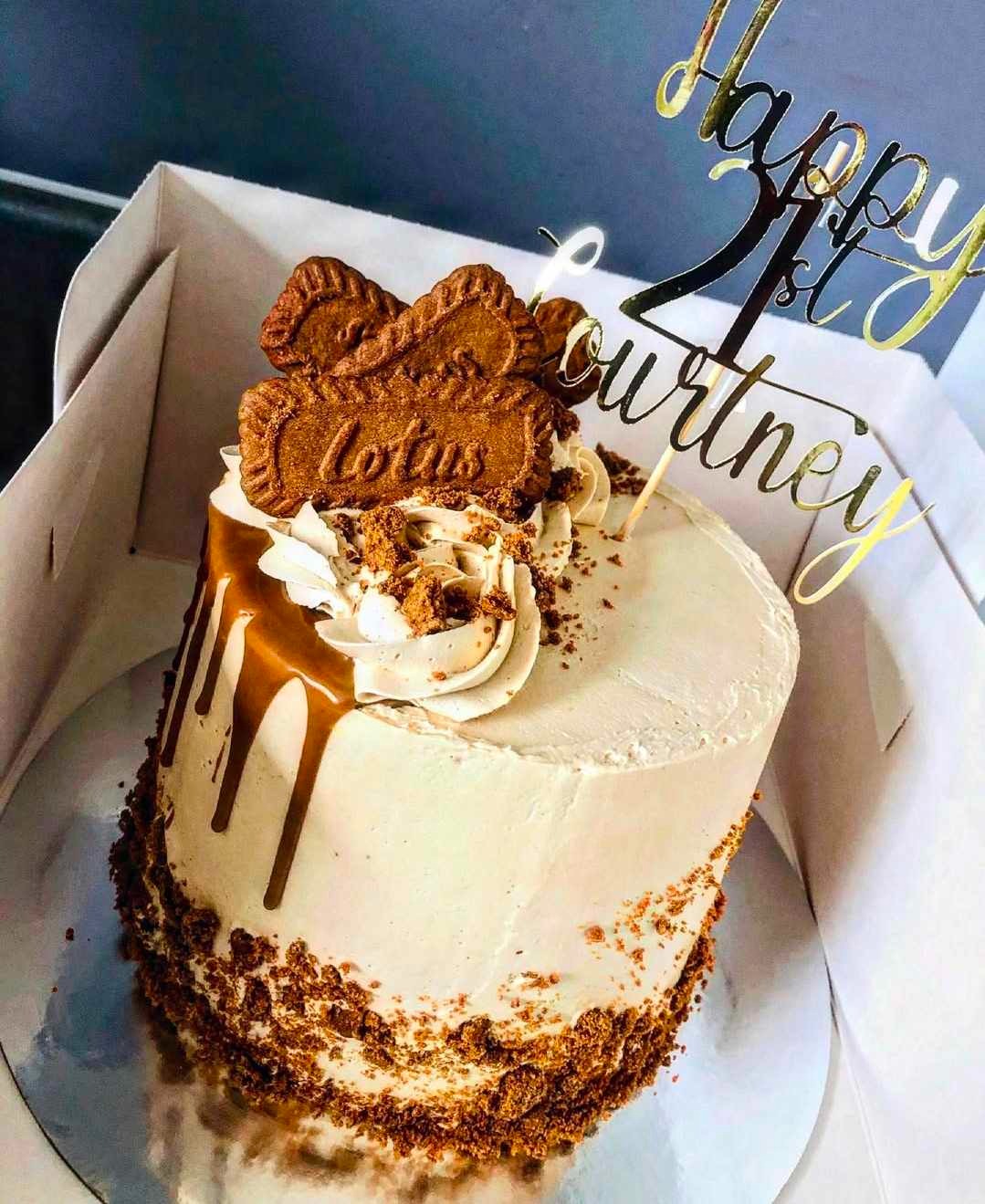 An indulgent Lotus Biscoff-inspired drip cake, finished with creamy buttercream, rich Lotus drip, and signature biscuit details. Perfect for dessert lovers and special occasions, offering a luxurious flavour experience.